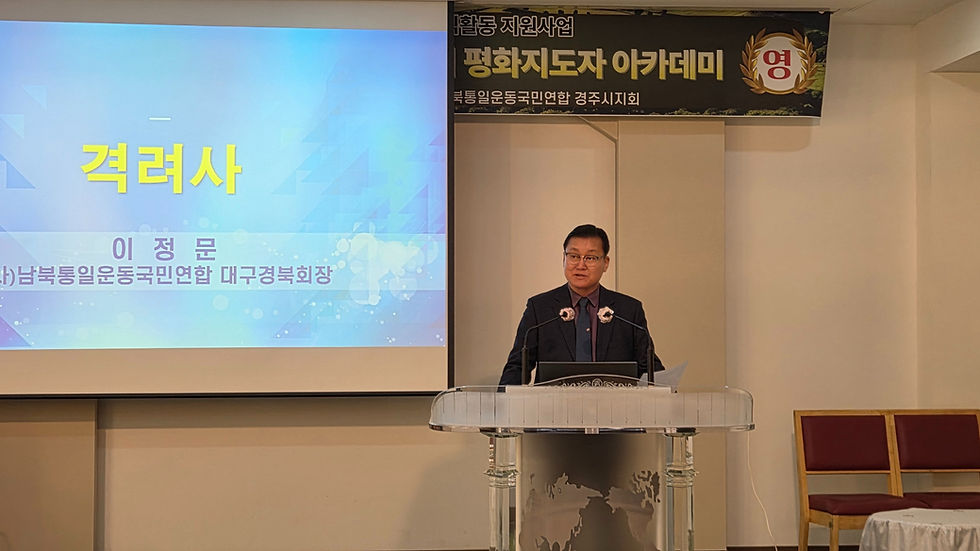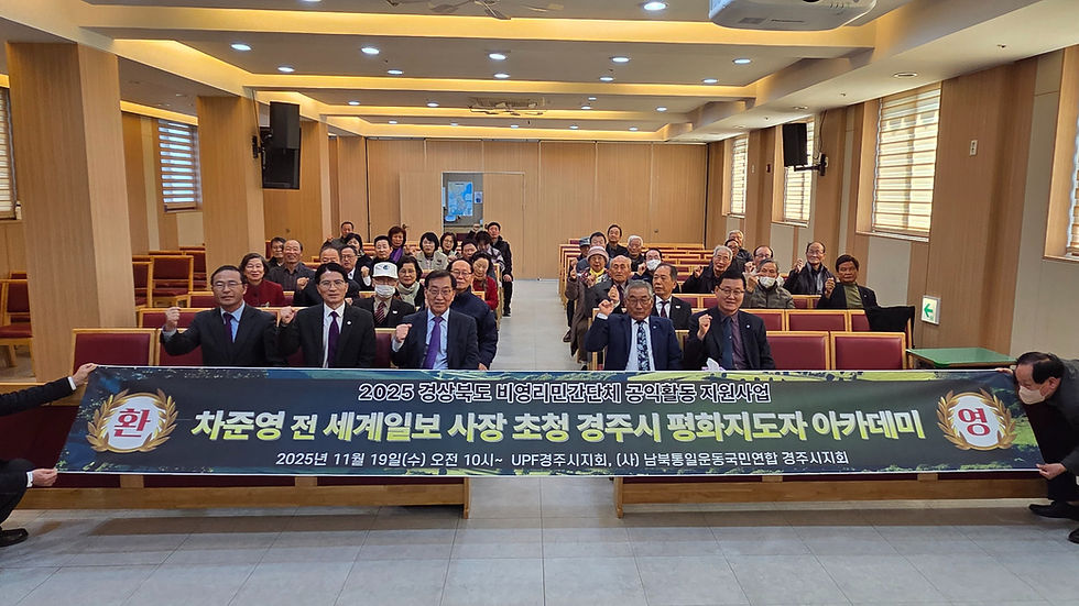 경주시평화대사협의회는 2025년 11월 19일 오전 10시 경주통일회관 세미나실에서 경북도청 공익활동지원사업의 일환으로 ‘제7차 경주 평화지도자아카데미’를 개최했다. 이번 특강은 월례회와 함께 진행되었으며 경주·영천 지역 평화대사 및 회원 40여 명이 참석했고 경북평화대사협의회와 UPF 대구·경북지회가 후원했다.
